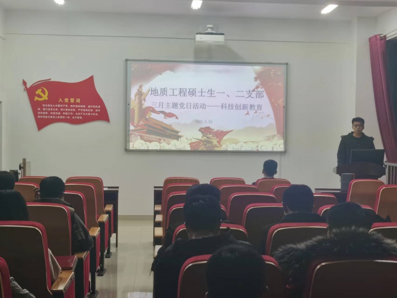 2023年3月22日,地科楼424室,地信院地质工程系硕士生一支部和二支部积极响应上级党组织的号召,认真落实“一月一课一片一实践”活动以及“新学期第一堂党课”活动,两个支部从邵拥军书记科技创新党课及谭静强教授的科研事迹中凝练出科研创新教育主题,并以三月份主题党日活动为契机联合召开了党员大会,以影片观看——学习榜样、制度政策解读——了解实情、经验交流——拓宽视野的内容形式进行了相关宣传工作。