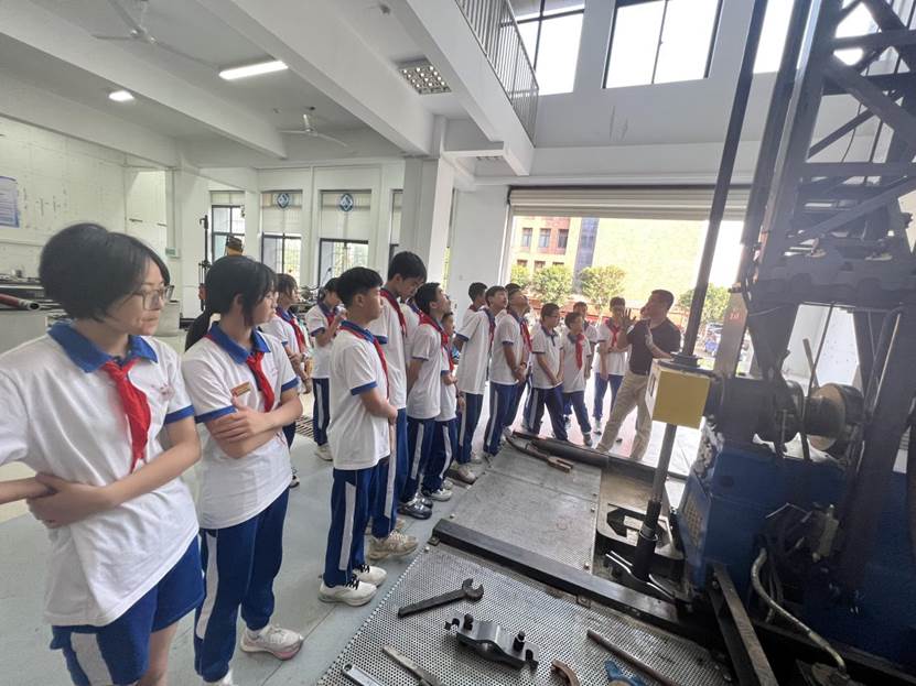 来到水文地质实验室,借助一个个生动的地质模型,在匡老师的讲授下,同学们了解了典型地质灾害的成因、危害以及治理方法,加深了保护地球环境的意识。随后,小朋友们跟随刘老师来到了钻探工程实验室。钻探工程是地质勘探的终极手段,把深埋地下的岩矿样品采取上来,就可以验证地质学家们的种种猜想。这里安装有一台四层楼高的千米钻机,仿佛一位巨人守护着地球的秘密。刘老师开动钻机,让孩子看到了模拟采集地球深部岩心岩样的过程。