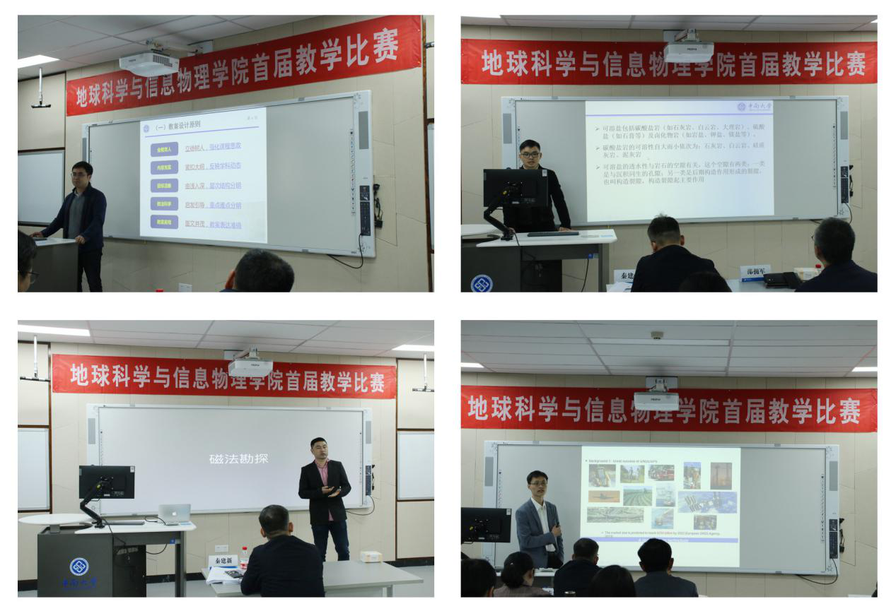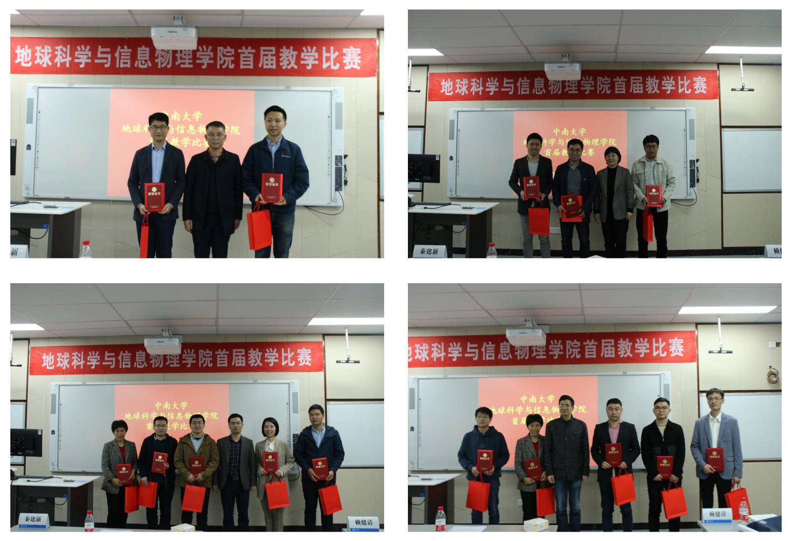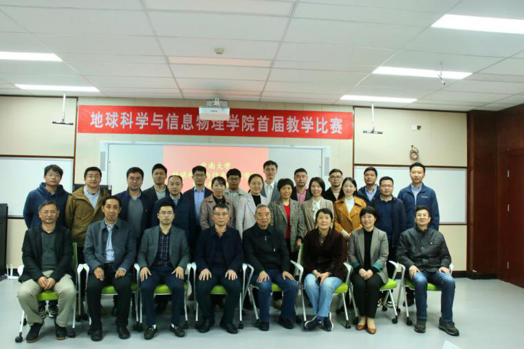 最后,石越老师宣布本次比赛的结果:郑涵、苗则朗老师获得地信院首届教学比赛一等奖;冯徽徽、付海强、康逊老师获得地信院首届教学比赛二等奖;汤玉奇、侯东阳、邓才华、刘飚、熊伊曲老师获得地信院首届教学比赛三等奖;吕桥、余文坤、陈必焰、郭振威、邓才华老师获得地信院首届教学比赛优胜奖。分别由秦建新教授、李建军副书记、邹滨副院长和赖健清教授为获奖选手颁奖并合影留念。