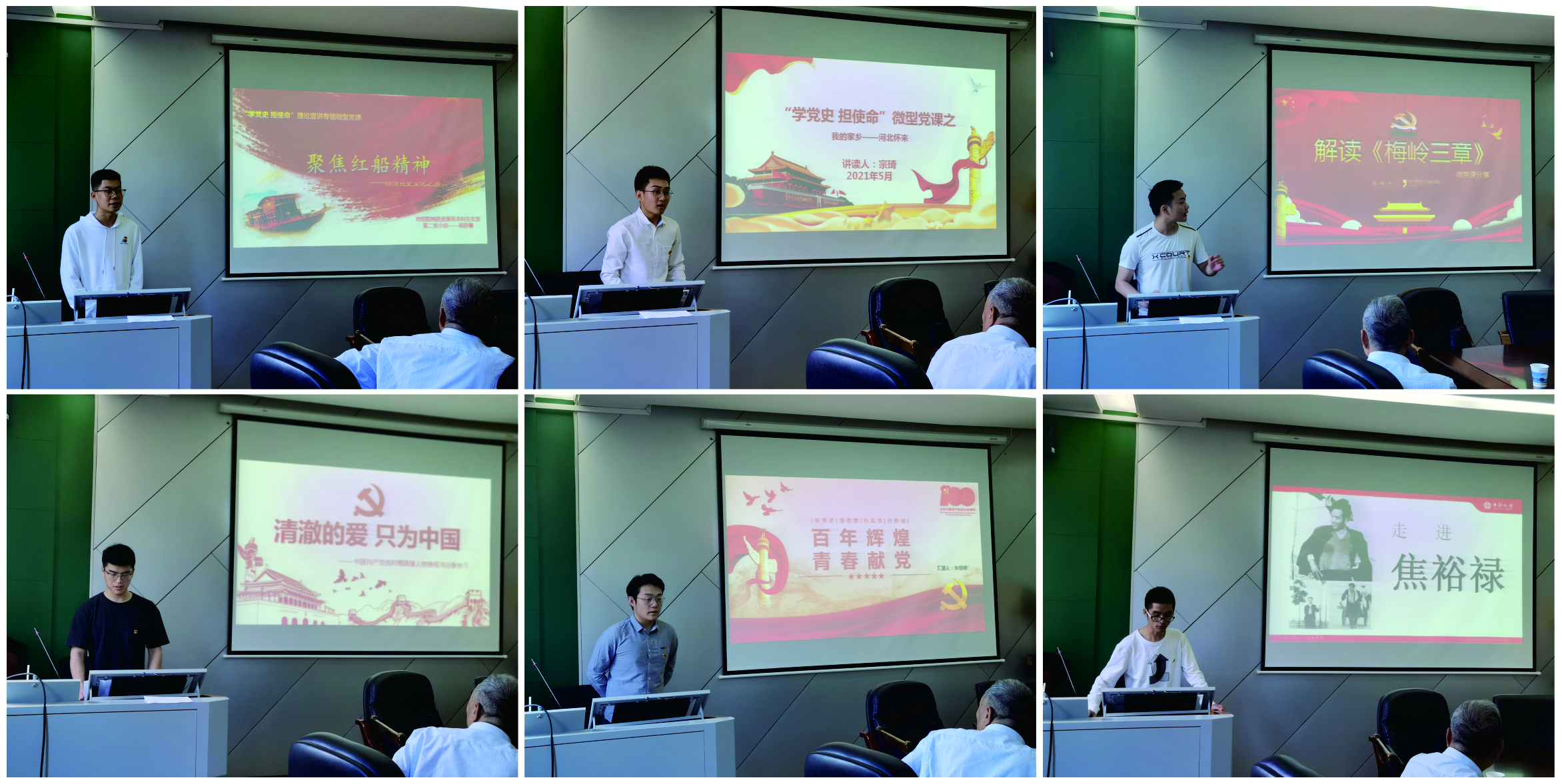 开展党史学习教育的实施方案》相关安排,地信院党委针对全院学院教工、学生党支部,于5月9日上午在校本部地学楼开展了“学党史 担使命”理论宣讲专题微型党课竞赛(决赛)活动。出席本次竞赛活动的有院党委书记邵拥军、院党委副书记兼关工委主任李建军、院关工委常务副主任胡祥昭、院关工委委员匡华凌、院研究生辅导员田可、院地质工程系硕士生支部书记刘飚、院团委书记刘琦。竞赛由地质资源系本科生党支部杨晨雨主持,来自学院各个党支部的党员代表现场观赛。