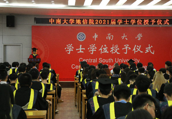 2021届毕业生毕业典礼暨学位授予仪式在校本部立言厅隆重举办,地信院党委书记邵拥军,院长戴前伟,党委副书记李建军,副院长邹滨,地质工程系孙平贺老师,测绘与遥感科学胡俊、冯徽徽、杨泽发老师,应用地球物理系冯德山、任政勇、肖建平、李帝铨、郭振威、张彬老师,地理信息系邓敏、张宝一、刘慧敏、陈杰老师,以及学工办全体辅导员与21届全体毕业生参加此次毕业典礼暨学位授予仪式。仪式由李建军副书记主持。