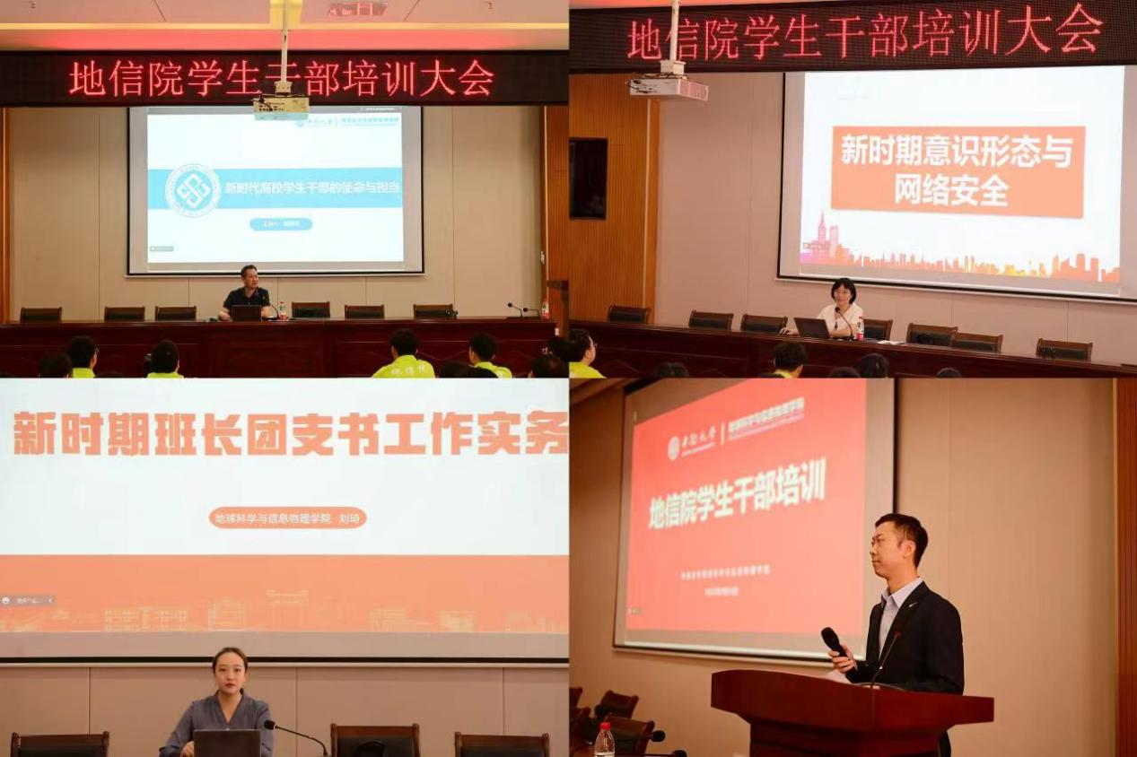 9月25日上午,地信院学生干部培训大会于地科楼127、地科楼214、地科楼424顺利召开。本次培训由地信院院长戴前伟、地信院党委副书记李建军、地信院团委书记刘琦主讲,并邀请本科生及研究生代表进行经验分享。地信院全体本研班长团支书参与培训,培训会由学院22级本科生辅导员刘凯主持。
