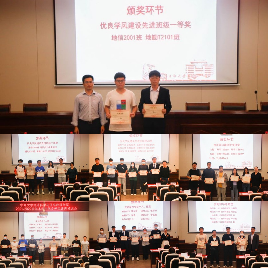 会议开始,学风建设专干何可沁老师从学院学风总体概述、课程不及格情况分析、学院学业帮扶举措和学院学风情况总结四个方面为在场师生汇报2021-2022学年地信院学风建设工作情况及成效。之后,邹滨副院长宣读表彰名单并讲话。名单包括优良学风建设优秀班级、优良学风建设班级单项奖、优良学风建设优秀寝室、学习进步个人、互助帮扶先进个人或寝室、优秀班导师助理等六类奖项,共有13个优秀班级、7个优秀寝室及20位优秀个人获得表彰。邹院长表示,希望获奖的集体和个人能够戒骄戒躁,未获奖的同学们也能努力向上、积极追赶,在今后的学习生活中相互学习和借鉴,取得令自己满意的成绩。随后由邹院长和李书记及各年级辅导员老师为获奖代表颁奖。