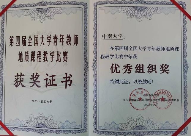 通过此次教学竞赛试讲暨课程思政教学经验交流活动,地质资源系青年教师进一步明确教师育人职责。地质资源系此次派出的张宇和曹勇华两位参赛教师,均在第四届全国大学青年教师地质课程教学比赛中取得了一等奖的优异成绩(图2)。学院课程思政教学研究中心也荣获教学比赛优秀组织奖(图3)。