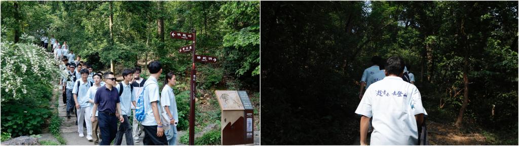 岳麓山校区升旗台前,李建成发表动员讲话,与师生代表共同列队,进行登山热身。热身运动结束后,大家于阶梯处集结,伴随着“趁青春,去登山”的口号,本次登山之旅正式开始。