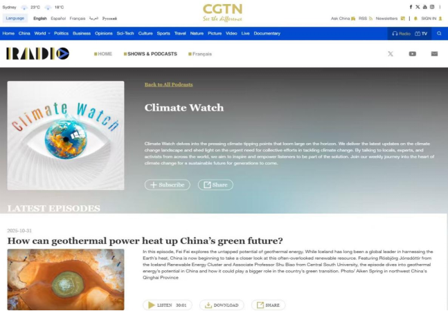 中国国际电视台(CGTN),是国务院直属正部级事业单位中央广播电视总台所属的中华人民共和国面向全球播出的新闻国际传播机构,与中央电视台CCTV、中央人民广播电台、中国国际广播电台属于同级中央媒体机构。CGTN气候播客Climate Watch节目是目前国内唯一一家聚焦气候问题的官方英文节目,该节目在苹果播客(Apple Podcasts)、Spotify、Amazon Music等十余家海内外播客平台同步更新。