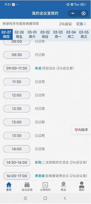 5. 点击“会议总览”,可以“按会议室”或“按日期”查看会议预约情况;