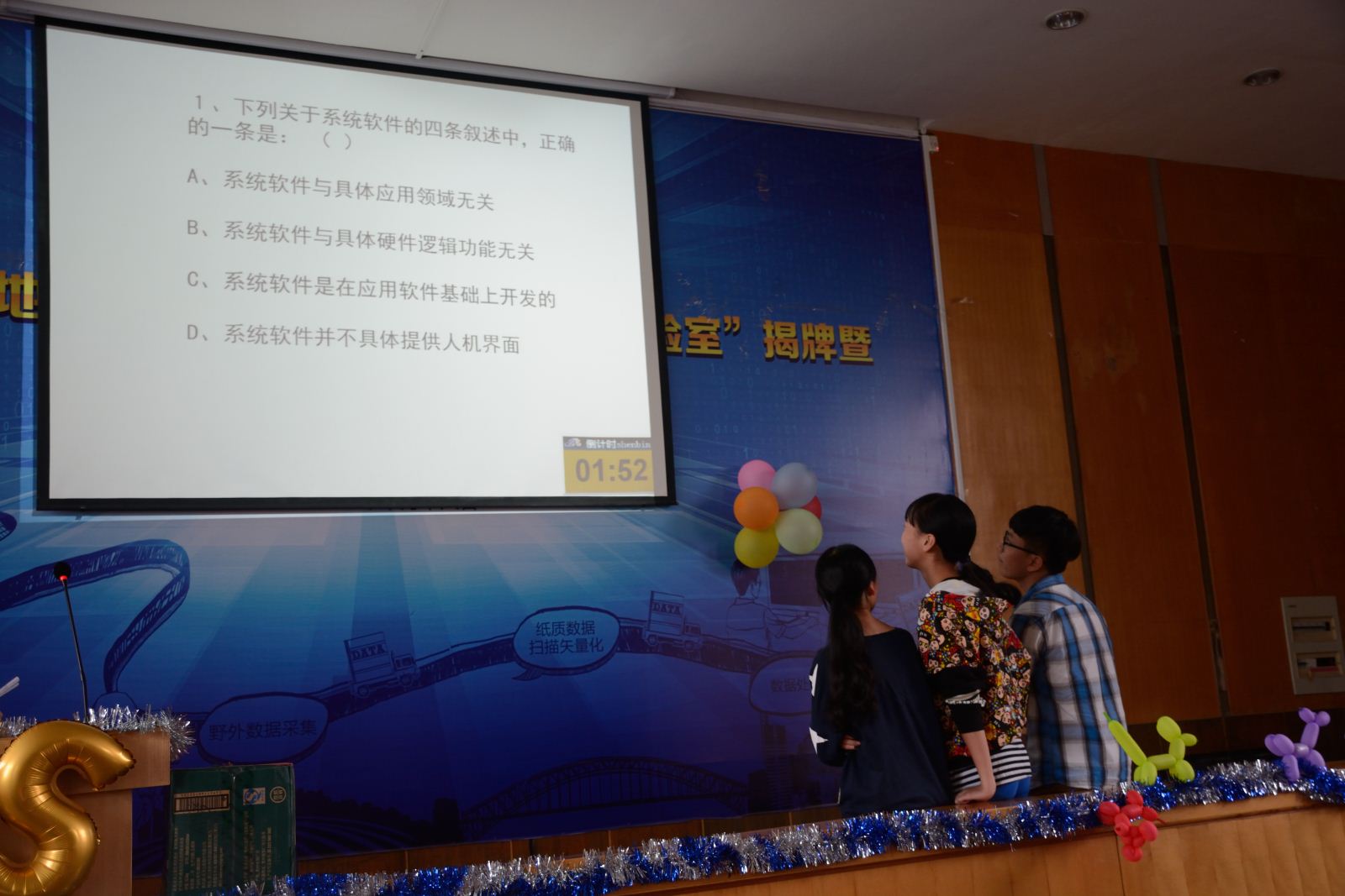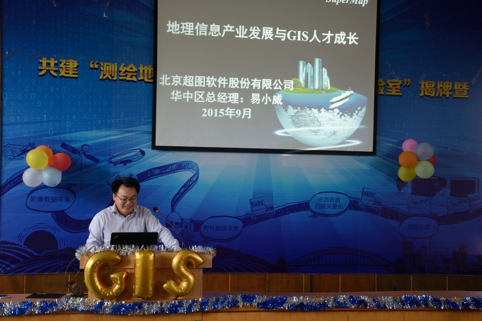 第八届GIS节”。本届GIS节由地信1301班吴闻主持,到场嘉宾有北京超图公司长沙分公司总经理易小威、超图湖南省分公司销售经理黄韬、地理信息系支部书记兼副主任张宝一、地理信息系副主任范冲、地理信息系副主任赵玲、地信院14级辅导员王少清、地信院学本七支部书记朱怡欢。