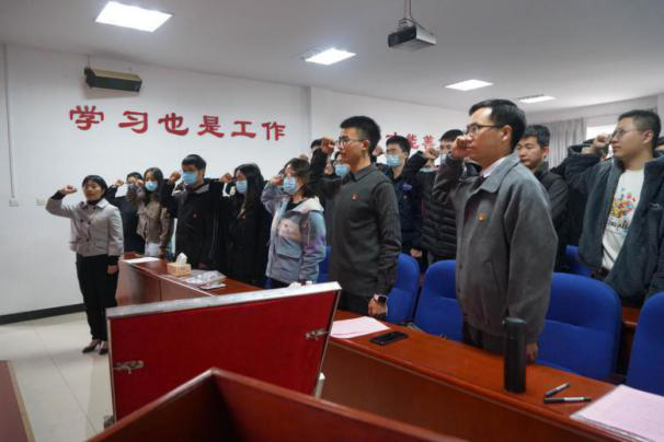 地信院党委分党校预备党员入党宣誓大会在南校区党校301会议室顺利举行。地信院党委李建军副书记、地质工程系本科生支部书记杨通田老师、地质资源系本科生支部书记杨晨雨老师、学生老党员代表以及2021年新发展的预备党员参加了宣誓仪式,仪式由杨通田老师主持。