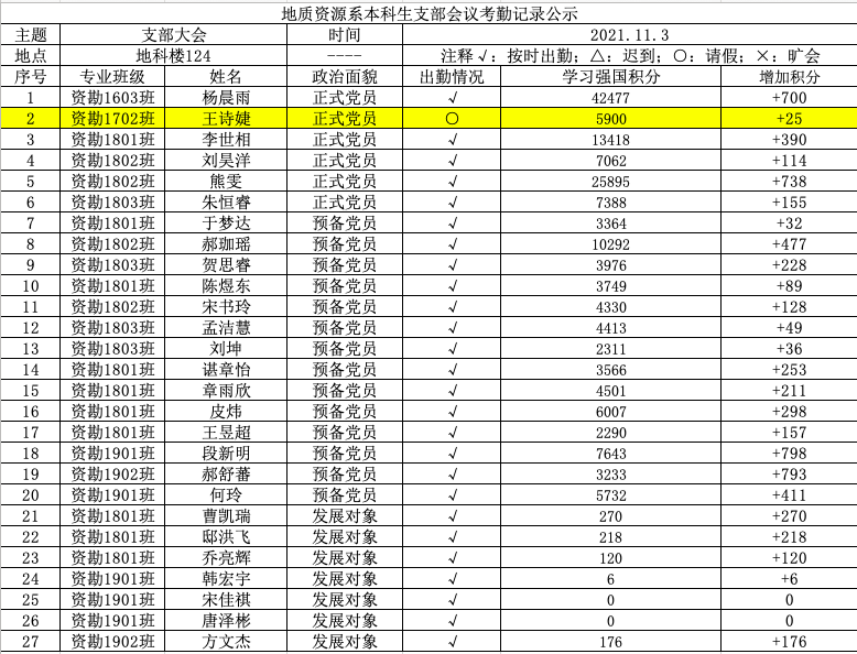 11月3日下午14:00,地信院地质资源系本科支部于地科楼124教室举行支部全体党员大会。会议的内容是进行党风廉政宣传和警示教育。本次会议由支部书记杨晨雨同志主持,支部全体同志参加本次会议。