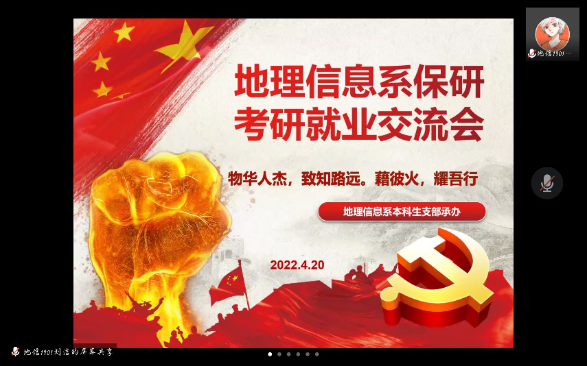 2022年4月20日下午14:30,地理信息系本科生支部在腾讯会议举办了地理信息系考研保研就业经验交流分享会。参加本次会议的嘉宾有地理信息系李海峰教授、张宝一教授和多位18级优秀学生代表,同时地理信息系本科生支部全体同志和地信专业19级全体同学均参与此次会议。