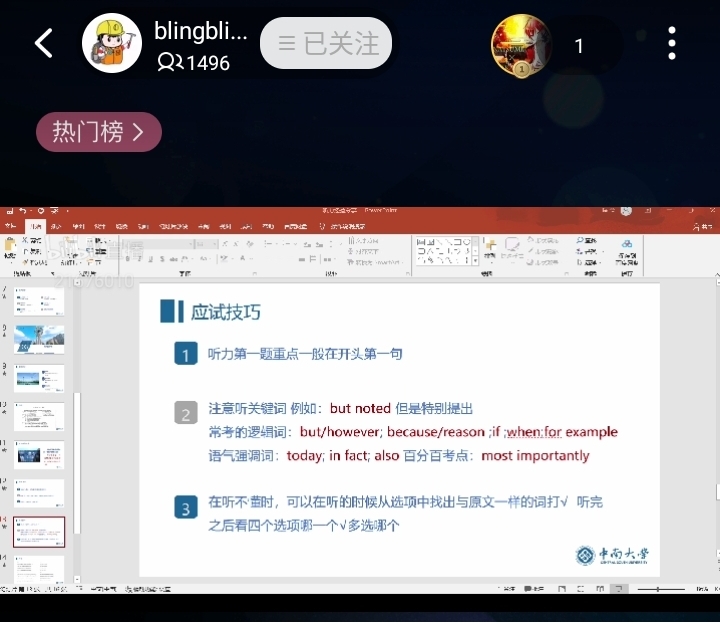 以情为桥,学识为绳,梦起中南,共赴未来。由地信院团委学生会主办的“极地漫谈”系列活动——英语四级经验分享会于2021年11月14日成功举办。为响应疫情防护号召,本次四级经验分享会以线上形式举办,并于11月14日下午三点在B站“blingbling地信君”账号进行直播。此次四级经验分享会由地信院地信2001班黄悠南、地信院地勘2001班李苇琪、地信院遥感2001班刘峰青主讲。