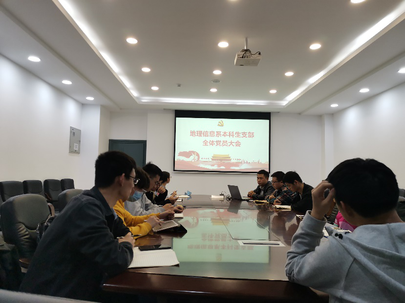 11月3日晚上21:00,地理信息系本科生支部于新校区地科楼214会议召开了党支部学习大会。本次活动由强俊同志主持,支部全体同志出席本次会议,党委副书记李建军老师莅临会议进行指导。