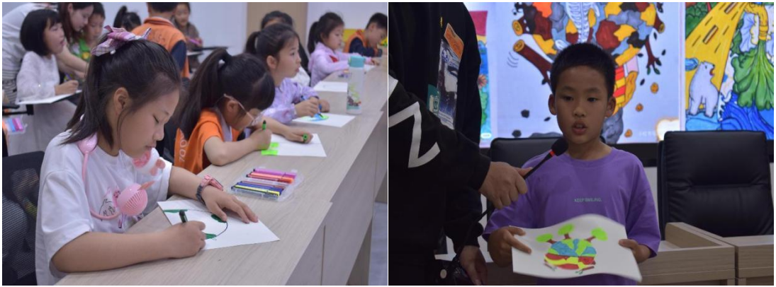 在手工互动环节中,孩子们在志愿者的带领下,亲手绘画各自心中地球母亲的形象,用水彩笔将各自对地球母亲的关爱和保护描绘在画纸上。通过绘画,孩子们不仅提高了对地球的认识,提升了科学素养以及环境保护意识,更重要的是鼓励孩子们在学习过程中通过动手实践的方式来认识世界,进一步地激发了孩子们的创造力和想象力。