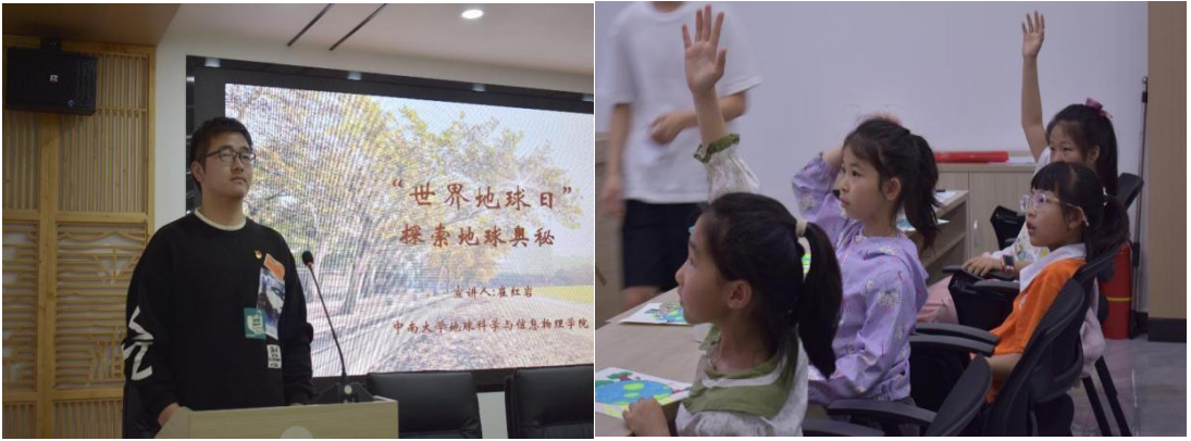 活动中,宣讲团成员崔红岩同学以精炼的语言和生动的多媒体展示,带领孩子们穿越亿万年的光阴隧道,追溯地球从诞生至今的地质年代变迁。接下来,宣讲员通过互动模型演示、3D动画展示,详细介绍了地球由外至内依次分布的地壳、地幔、外核与内核这四大圈层的特点、形成机制及其对地球表面环境与生命活动的重要影响,使得看似遥远而抽象的地球内部世界变得生动而亲切。在科普地质知识的同时,宣讲员巧妙地将地球科学与环保理念紧密相连,诉说地球生态系统具有内在的脆弱性,人类活动对环境的改变可能引发不可逆的后果。通过对地质年代中生物多样性变化的剖析,孩子们意识到了保护现有生物多样性、维持生态平衡的重要性。