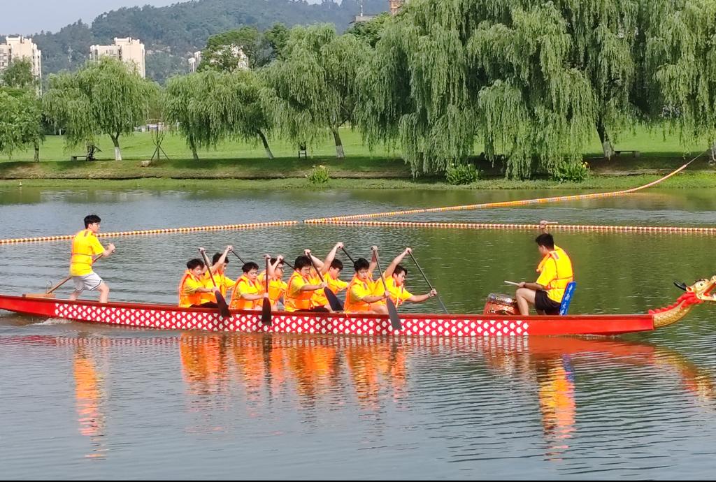 地信院龙舟队在第一轮比赛中出场。随着比赛一声哨响,龙舟向前驶去,参赛者们身穿统一的服装,手持长浆,奋力划动。在富有节奏的鼓点声中,他们将力量汇聚于手中,动作整齐划一,精神昂扬向上,推动着龙舟飞速向终点前进。最终龙头过线,他们取得了1分33秒的成绩,位列第九名。