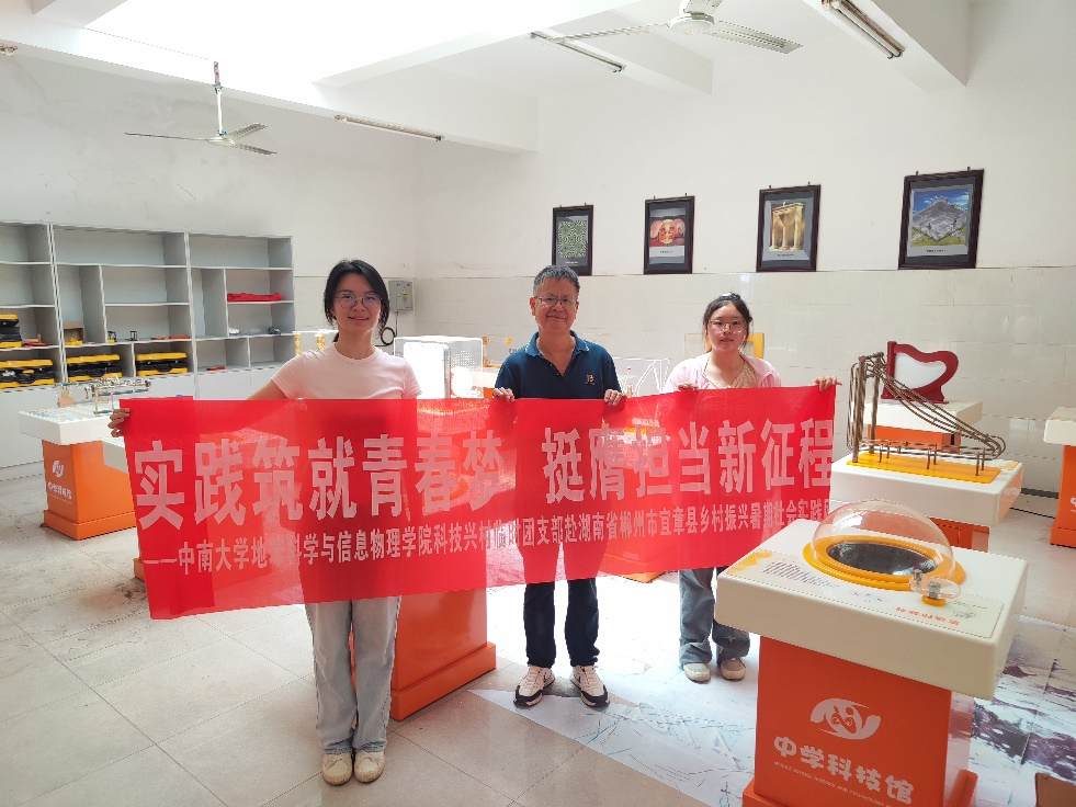 地信院科技兴村临时团支部赴郴州市宜章县乡村振兴暑期社会实践团在宜章县一中校长张永强的带领下深入校园,探访了校园的科技馆与图书馆,深入了解了校园课外教学内容的具体情况。