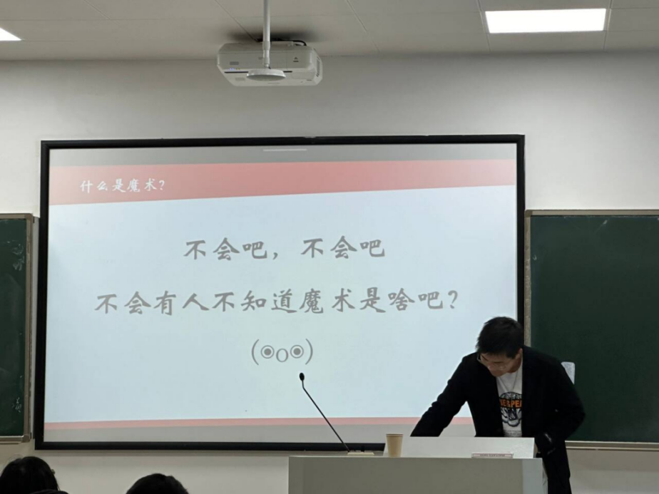 活动伊始,魔术社社长覃思源欢迎辞,对新成员的加入表示热烈欢迎,并简要介绍了社团的发展历程宗旨。随后,社长对纸牌魔术和花切的基本知识进行了简单介绍并附上视频供大家欣赏学习。覃同学提到,魔术社不仅是一个学习魔术技巧的平台,更是一个培养创造力、表现力和团队合作精神的大家庭,魔术这艺术需要大家齐心协力地传播和发扬。