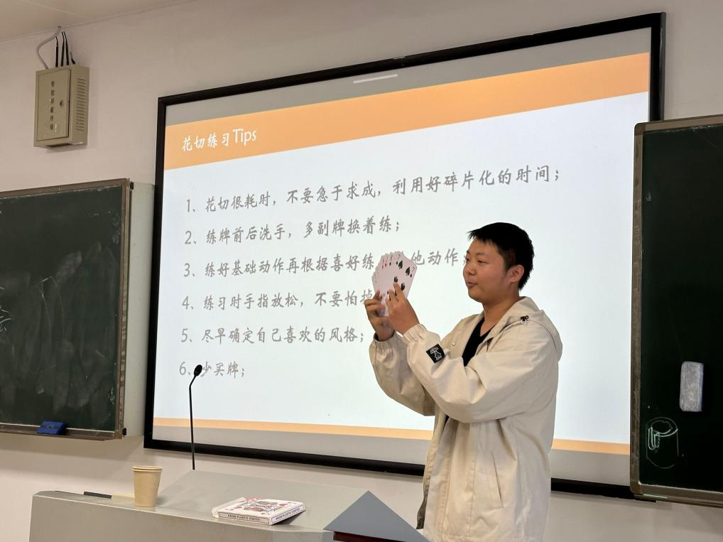 社长发言后,老社员们纷纷上台展示自己的拿手魔术。他们手法娴熟、技艺精湛,从神奇的纸牌魔术到令人目瞪口呆的近景魔术,每一个表演都赢得了阵阵掌声。为了让新社员更好地了解魔术,社团干部使用多种多样的网络资源进行教学辅助从魔术的基本原理、手法技巧等方面进行了详细的讲解,并亲自示范了一些简单易学的魔术。在互动环节,大家彼此分享自己对纸牌的热爱和感悟现场氛围热闹异常。