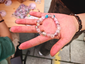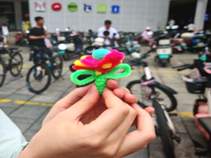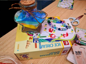 手工创作区的 “扭扭棒编织”与“正能量手链” 项目备受青睐。彩色扭扭棒在同学们的指尖变成花朵、小动物、手环等可爱形状,“能量手链”制作区内,同学们依据颜色的心理学象征以及个人喜好进行搭配,手链成品风格多样,各具特色。活动现场,手工作品设计思路的交流与成品展示的喜悦,让手工区成为温暖的“情绪传递场”。
