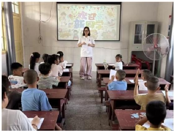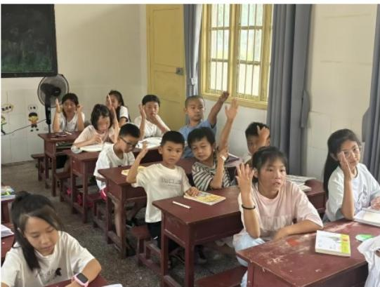 7月20日,团队开展开学第一课。开学第一课的首要目标,是让孩子们彼此熟悉,并与老师建立信任,共同营造友爱、安全的学习环境。“这是我画的火箭,这是向日葵!”两位小姑娘迫不及待地拉住老师的手,分享精心制作的介绍卡。在“击鼓传花”游戏中,拿到玩具的小男孩在大家鼓励下走上讲台,流利地背出新学的古诗,赢得满堂掌声。初见的陌生和羞涩,在笑声、掌声和鼓励声中悄然褪去。一堂精心设计的破冰课,让来自不同村组的孩子们迅速融为一个温暖的集体。