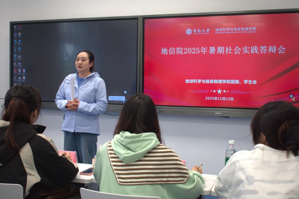1112日下午1400,地信院2025年暑期社会实践总结答辩会于新校区A218教室顺利召开。院团委书记刘琦老师、地信院第十四、十五届学生会主席团成员、校团委社会实践部新媒体中心副主任钱敏任评委。本次答辩会由涂梦涓同学主持,地信院6支社会实践团队参与答辩。
