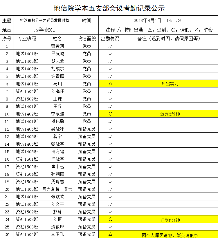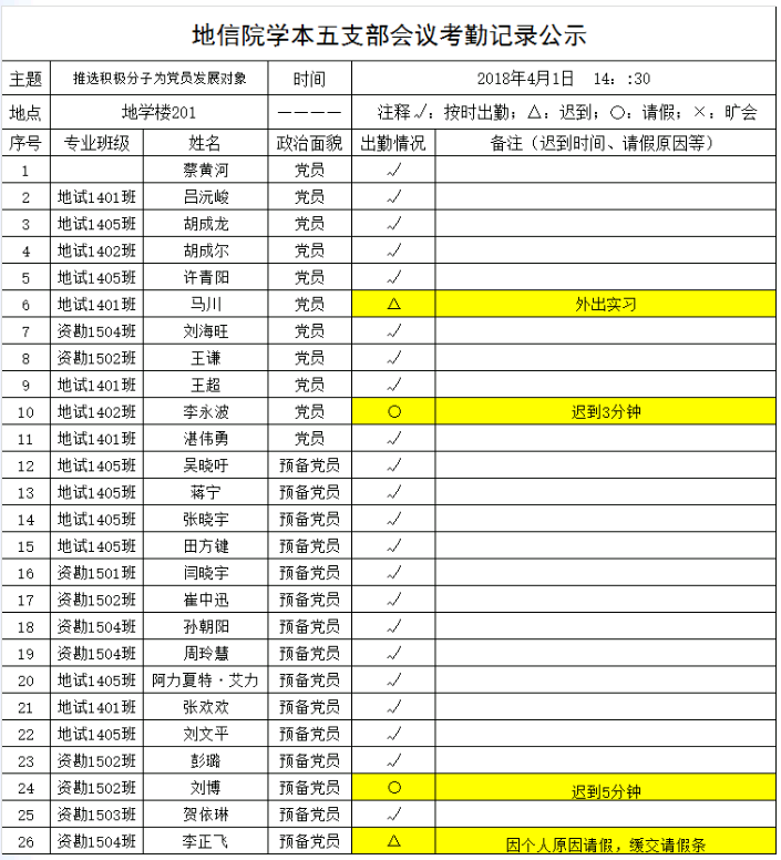 2018年4月1日下午,地信院学本五支部召开支部党员大会,讨论发展对象事宜。将出勤情况公示如下,接受党内外群众监督。
