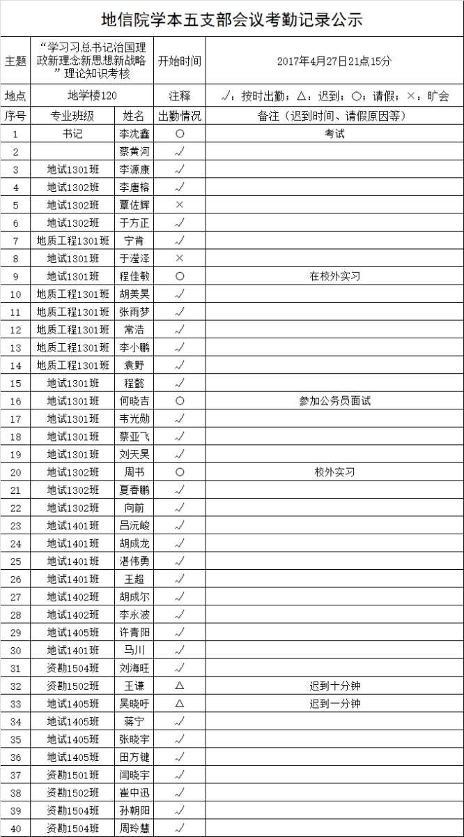 2017年4月27日晚,地信院学本五支部进行“学习习总书记治国理政新理念新思想新战略”理论知识考核。将出勤情况公示如下,接受群众监督。