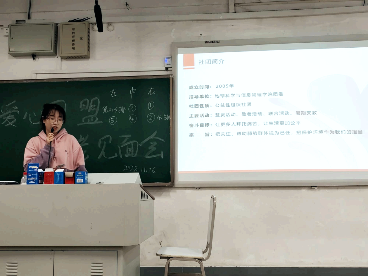 为进一步培养大学生的全面发展,提高同学们的道德修养,同时配合学校防疫要求,公益服务类社团爱心同盟开启线上招新,如今招新进入尾声,社团于11月26日在91论坛 新校区A117教室进行了线下新老社员见面会,本次见面会由副会长王冰组织,主题为“拥有爱心让我们相遇,践行公益使你我成长”,并且邀请了各级段全部新成员与部分老成员参与。