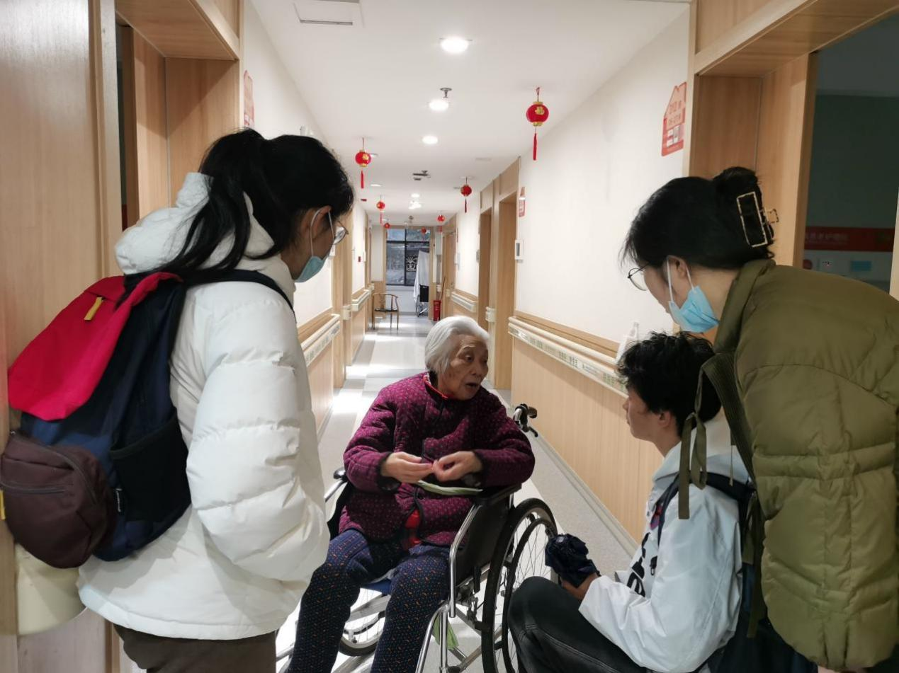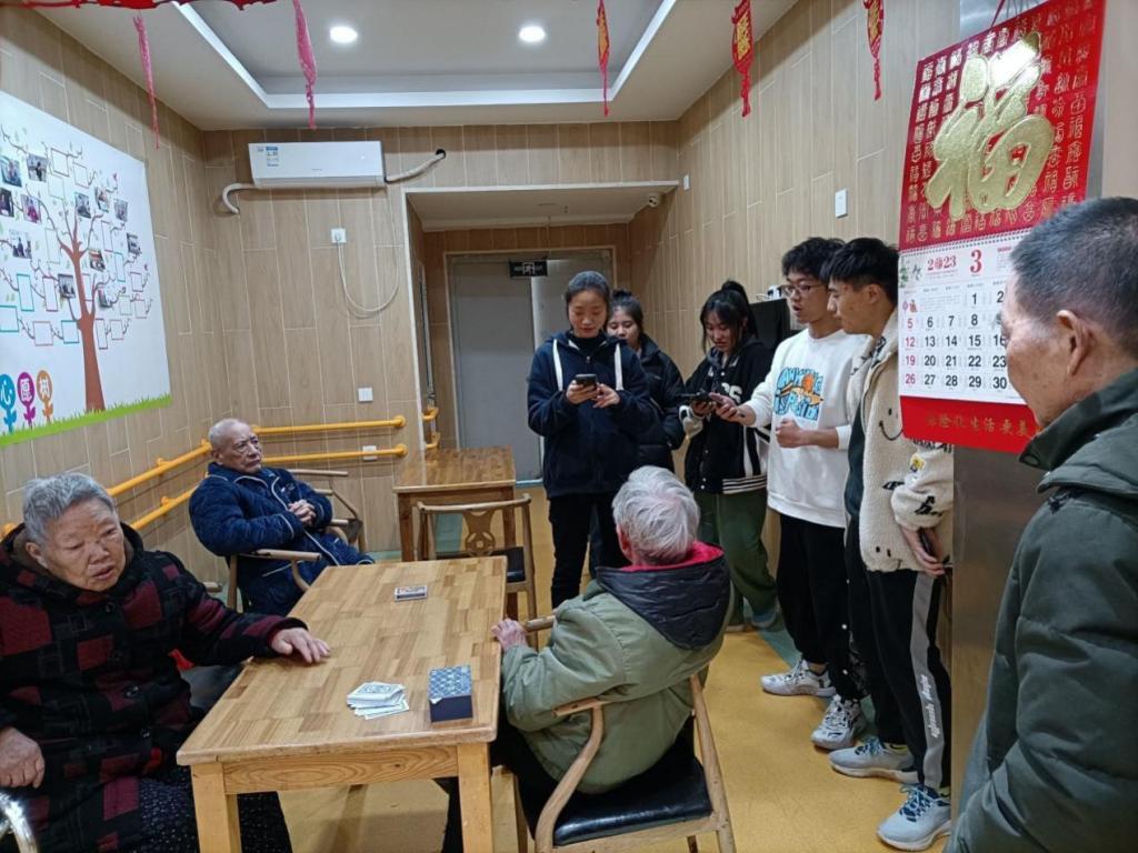 活动中,每一个小组负责一个楼层,与该楼层的老人交谈、娱乐,交流的形式各组不一样,有些组选择唱红歌拉近与老人的距离,有些组则与老人一起玩扑克、下棋,起到活跃气氛的作用。