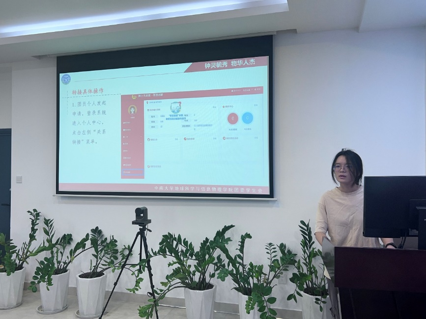 会上,刘琦老师结合当下加强新时代团的基层建设工作背景,阐述了本次培训会议的重要意义,强调了本次团组织关系转出工作对毕业生团员的重要性。随后,院团委组织部副部长周芙蓉带领大家集中学习了相关文件,着重讲解线上“智慧团建”系统团组织关系转接工作相关注意事项,详细说明“智慧团建”团组织关系转出工作的操作流程、毕业生去向分类、时间节点等相关工作要求。