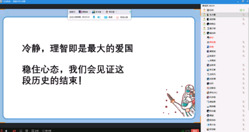 由于疫情原因,此次班会通过线上QQ语音进行。通知的时间一到,班导师侯东阳和同学们准时上线,开始此次班会。班会上,班导师首先讲话,他告诫同学们在日常生活中出门要戴口罩,做好疫情防范工作。接着他总结了一下班级在学习方面仍然存在的问题,希望同学们志在高远,在家里认真学习线上课程。接下来,班长刘洁主持班会继续进行。