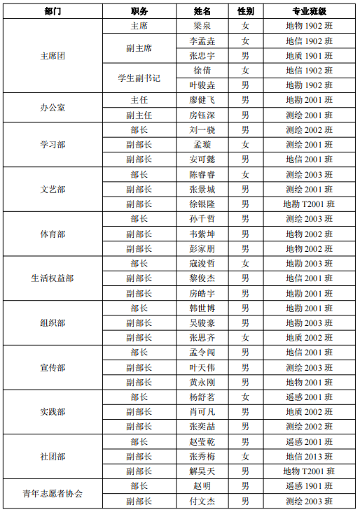 经学生自主报名、团支部推荐、辅导员审核、简历筛选、个人展示及答辩、综合考察等环节,推选梁泉等33人为地信院第十二届团委、学生会执行委员会成员考察人选,考察试用期两个月,现将人员名单公示如下(排名不分先后):